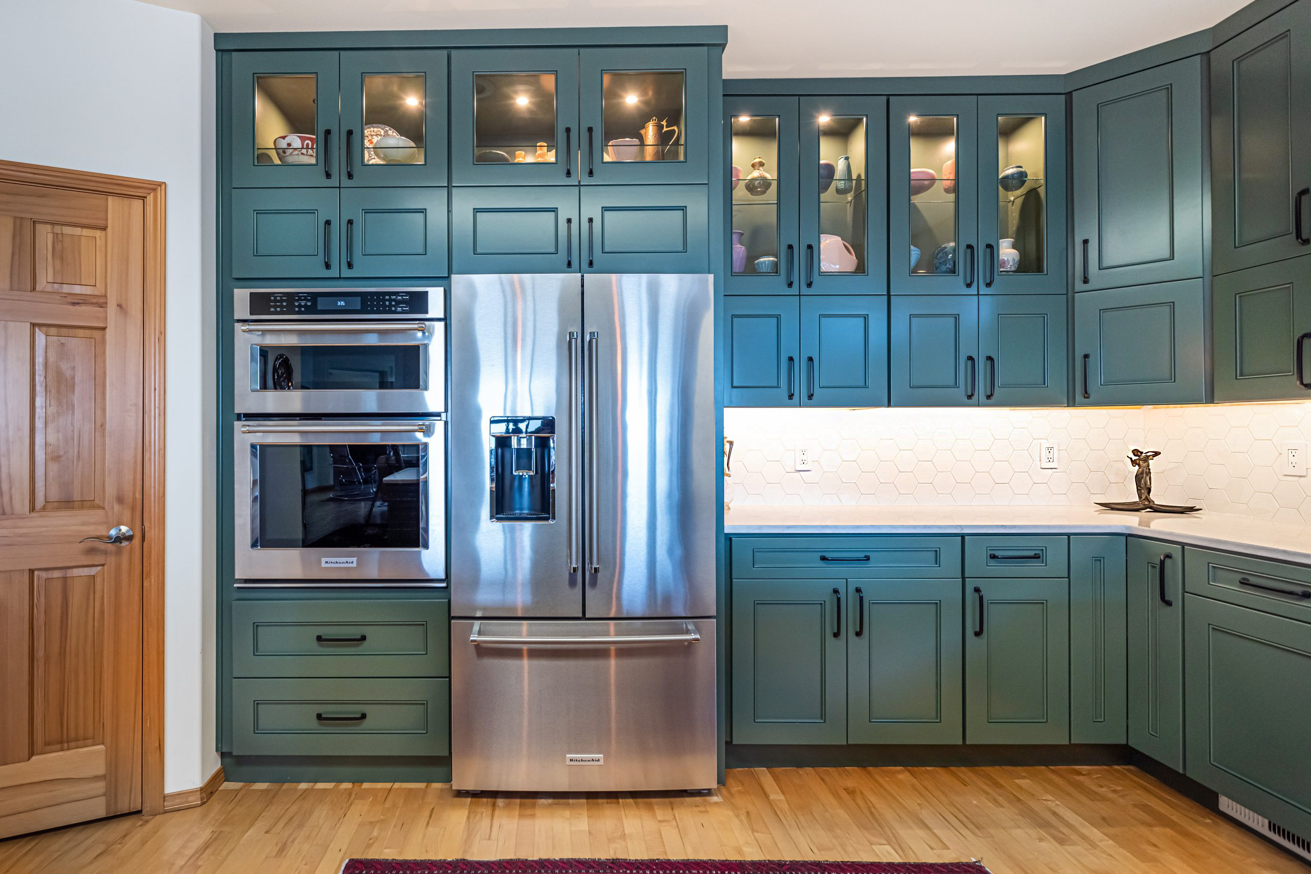 Instead of creating extra storage in the kitchen, the homeowner wanted to infuse their love of art into the design as well. By adding glass doors to the upper cabinets and wiring in-cabinet lights, it gave the homeowner an amazing showcase for favorite art pieces.